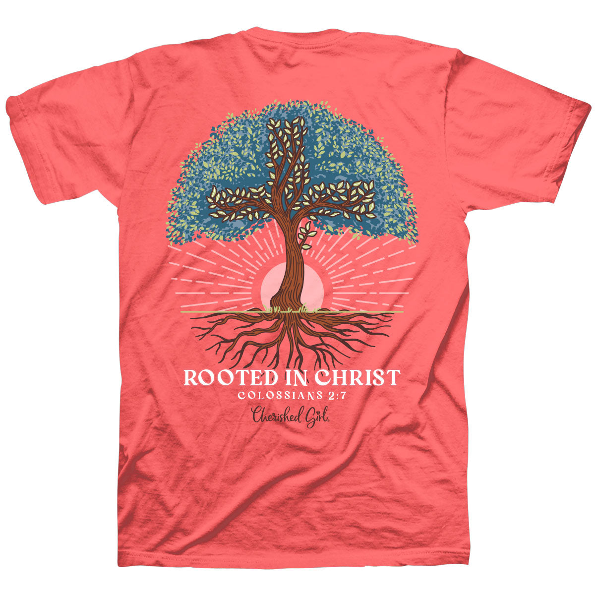 Grow strong roots of faith in this ?Rooted In Christ? Cherished Girl? T-Shirt in Coral Silk. Whichever way the wind blows, we can hold fast against all circumstances through our faith in Jesus.